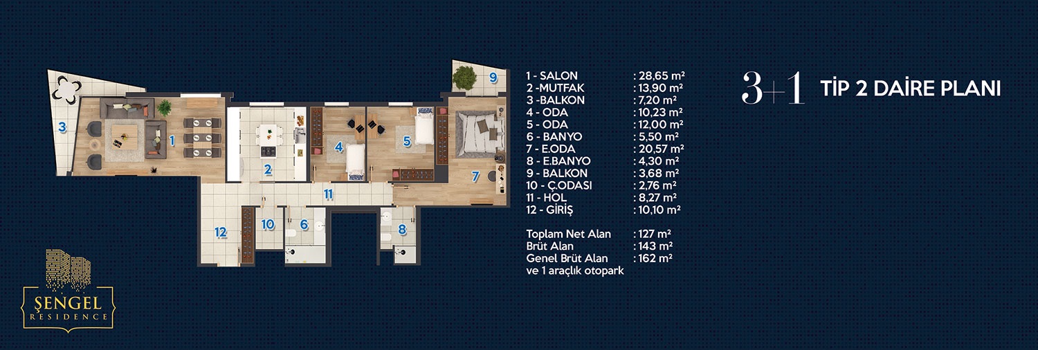 Genel Brüt 171 m2 / 162 m2 ve 1 araçlık otopark